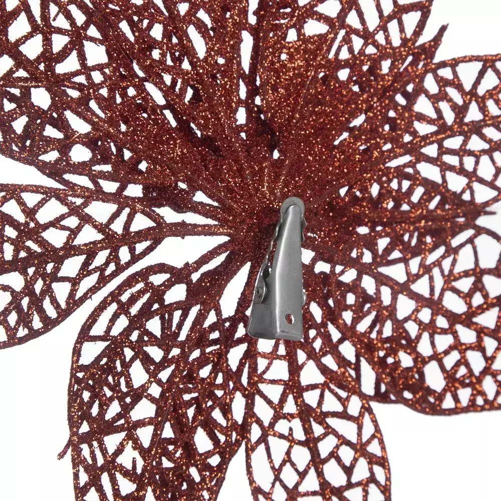 O Enfeite Flor Natalina é produzido em plástico com acabamento em glitter, medindo 6 cm cada. Possui presilhas no verso que facilitam a fixação nos galhos da árvore de Natal, tornando a decoração prática e encantadora.